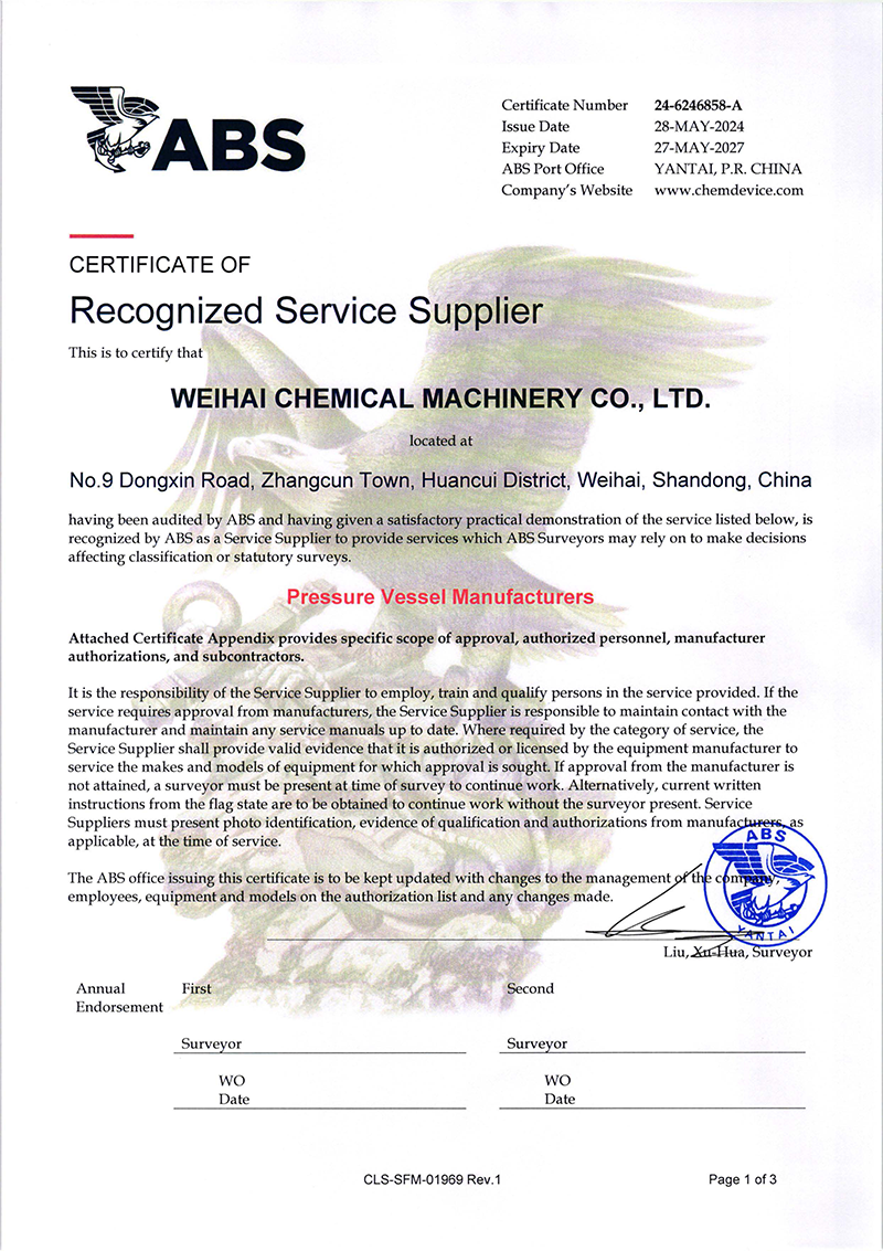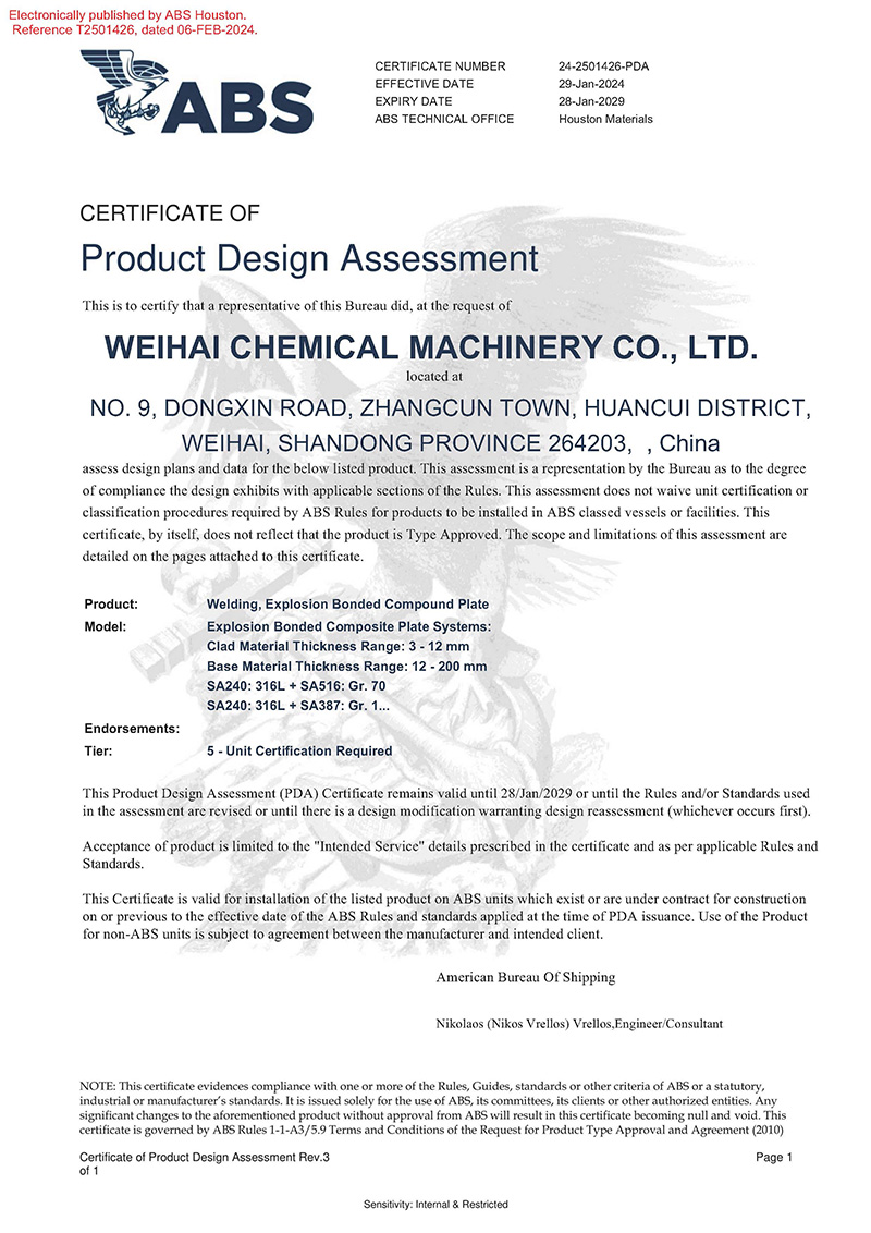 近日,威海化机顺利获得美国船级社(ABS)颁发的产品设计PDA认可证书,认可产品名称为“爆炸焊接复合板”,涵盖产品种类:ASME SA264、ASME SA265、ASTM B898标准…
